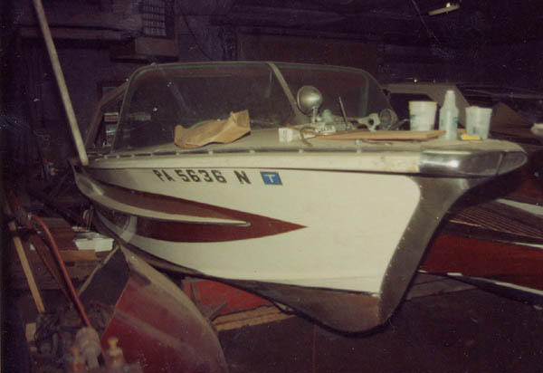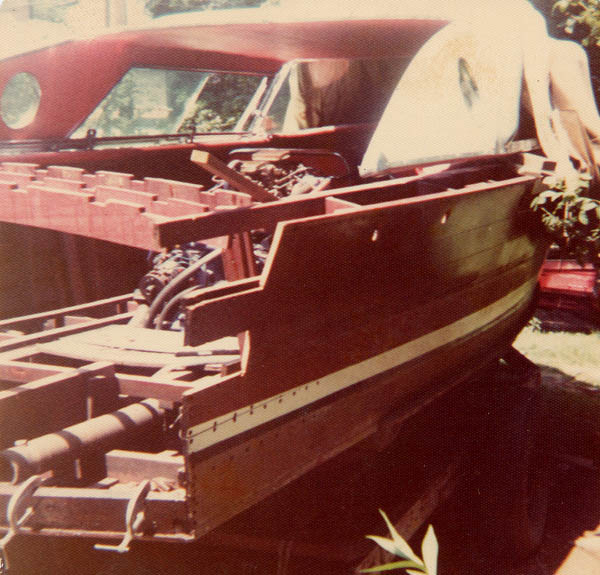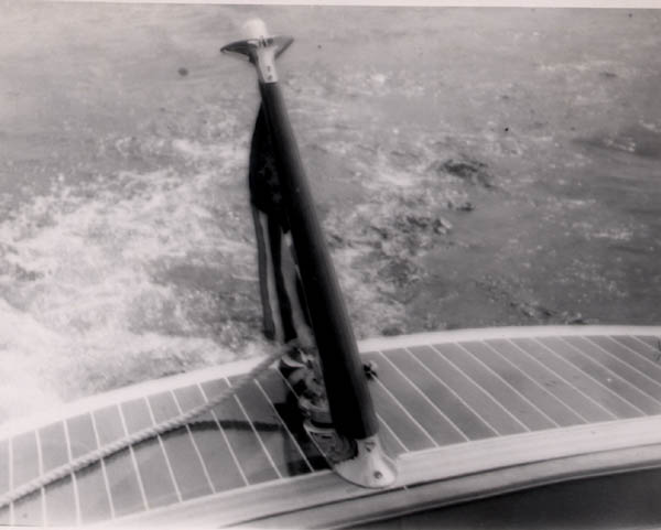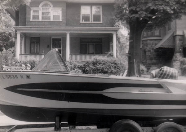 It is evident that the boat is moving very fast. (Note where the spray breaks from the chines, approx 18" from the stern.) This 275 hp. Chrysler Hemi powered Coronado was clocked at close to 60 mph., in a measured mile. This is very impressive for a stock 1959 boat. At this time there was not a faster boat on Conneaut Lake, and in our usage, 10 seasons, (1967- 1976) no boat ever beat it in a race. Actually a newer Coronado, a 1962 with a 325 hp. Cadillac Crusader could not keep up even though it had 50 more hp. That boat topped out in the upper 50mph range.