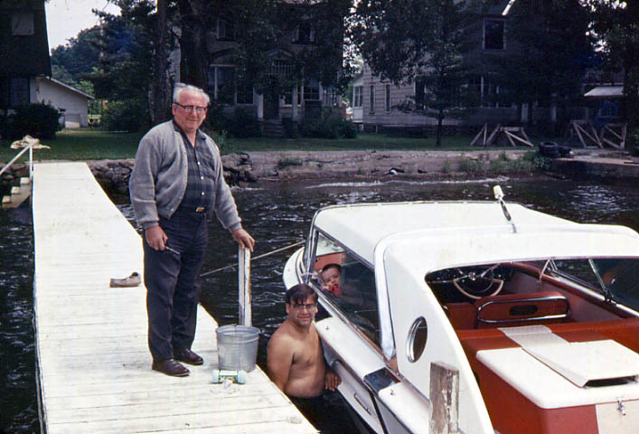 This is one year later, July 1968. That is my grandfather Charles L. Miklos, My dad Chuck, and me sticking my head out the window of the boat. The house in the center (not ours) was moved back and across the road in 1982. A much smaller house now stands there.