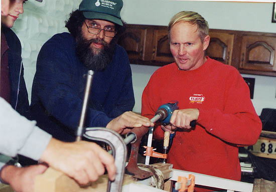 Chuck drilling the shaft hole, while Tom Shanor oils the strut.