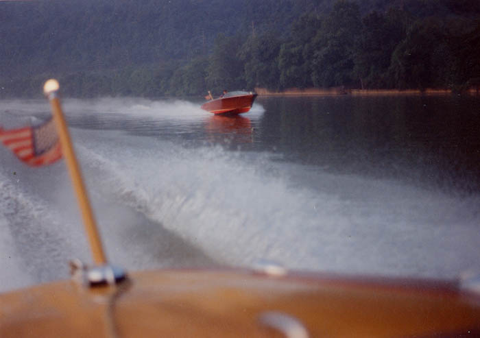 Capri # 21CP020 running at speed, Erik Miklos at the wheel. We clocked these boats at 49 mph. with the 351 Ford Pleasure Craft Marine engine. We were running parrell to a truck along the shore we were in contact via radio. We were going down stream, so our actual speed may have been a little slower. This photo was taken along the Monongahela River at Sand Castel.