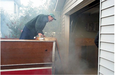 The second workshop for the fall of 2001 was held at Chuck Niceley's garage. We worked on fitting chines on Chuck's 1940 Garwood 16' split cockpit Runabout. We also worked on Gretchen Dosch's 1951 Chris Craft 22' Utility's engine. We got it running, it had not run since the 1980s. We then re winterized the engine.