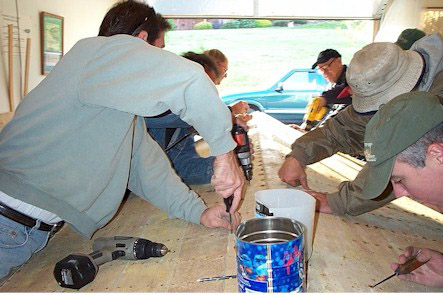 The Second workshop started at Chuck Niceley's garage and later moved to Doug Chassee's garage to remove the bottom of his boat for reseting. Attendees to the workshop were Doug Chassee, Gretchen Dosch, Tom Englart, Tom Kohler, Chuck Niceley, Art Lowrie, Alex Miklos, Bob Miklos, Chuck Miklos, Erik Miklos, Frank Miklos, Josh Miklos, Paul Miklos, John Patrick, Frank Senseck, and Tom Shannor.