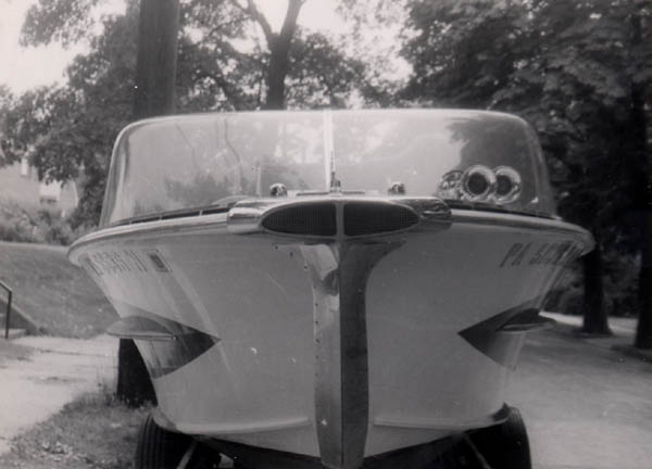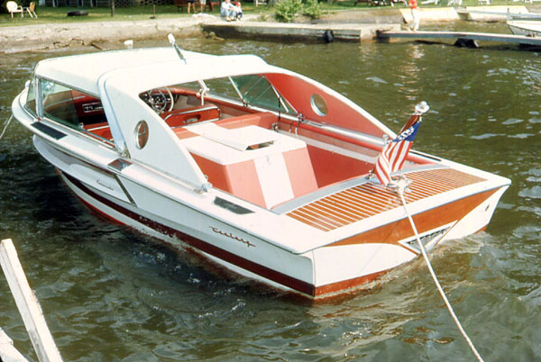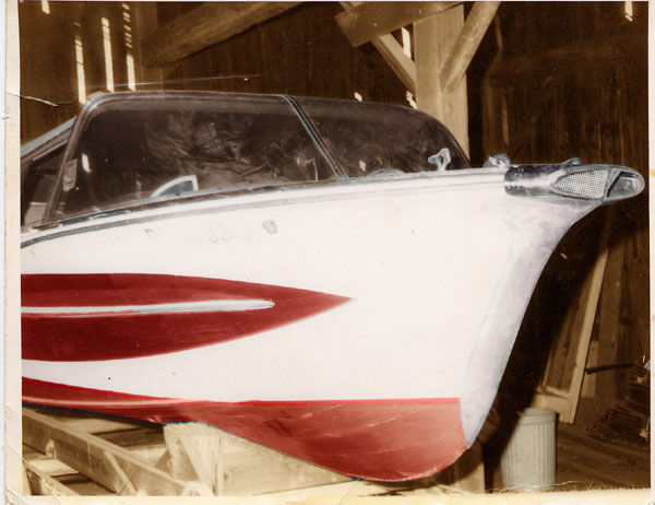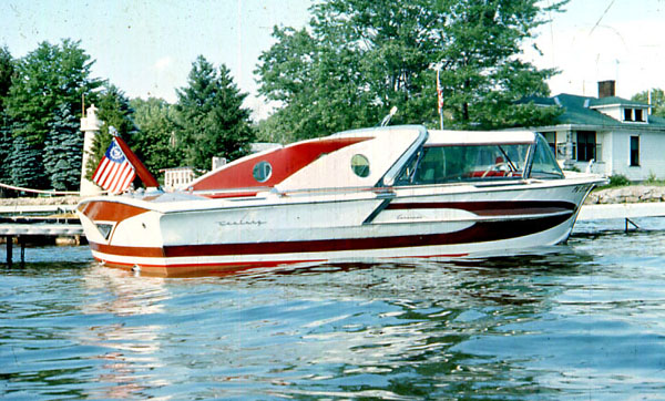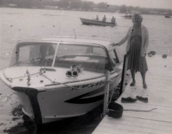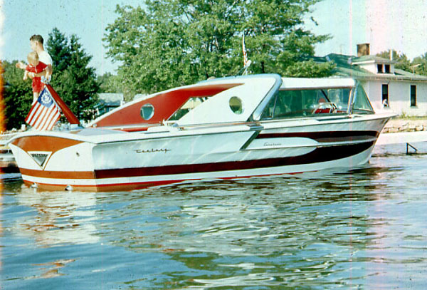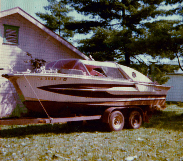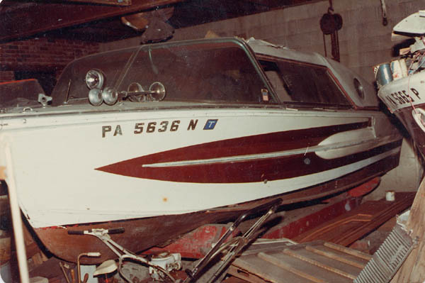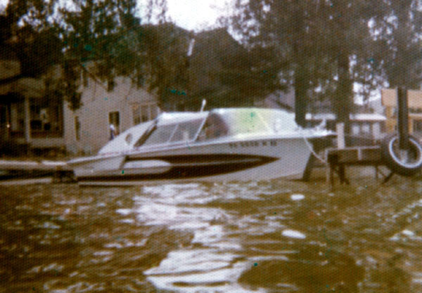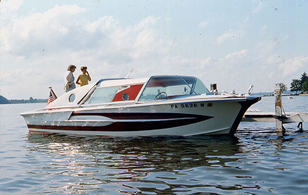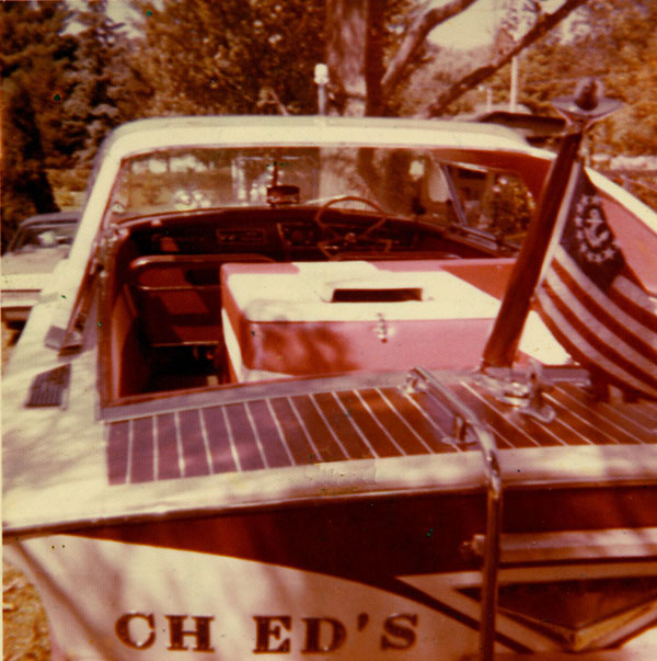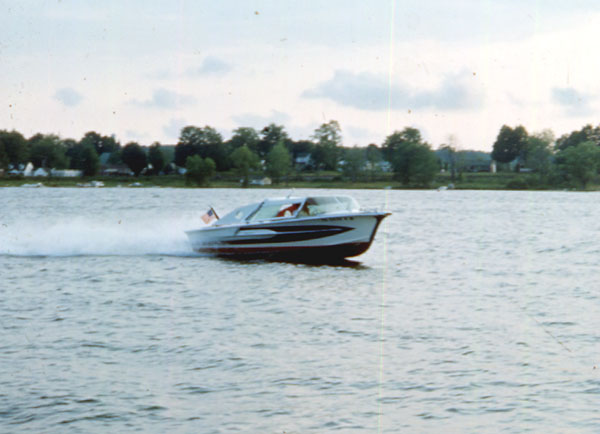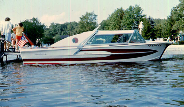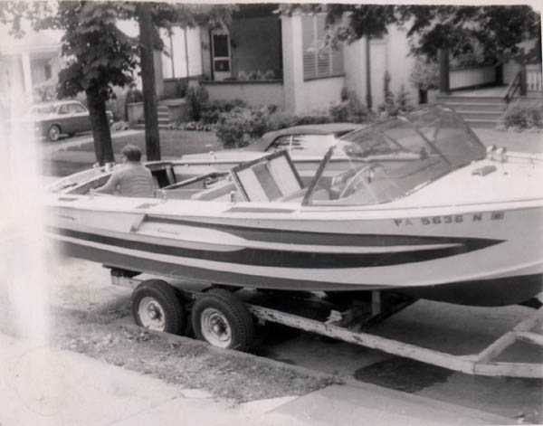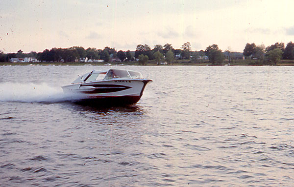 It is evident that the boat is moving very fast. (Note where the spray breaks from the chines, approx 18" from the stern.) This 275 hp. Chrysler Hemi powered Coronado was clocked at close to 60 mph., in a measured mile. This is very impressive for a stock 1959 boat. At this time there was not a faster boat on Conneaut Lake, and in our usage, 10 seasons, (1967- 1976) no boat ever beat it in a race. Actually a newer Coronado, a 1962 with a 325 hp. Cadillac Crusader could not keep up even though it had 50 more hp. That boat topped out in the upper 50mph range.