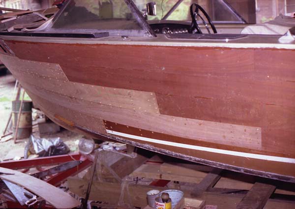This boat was damaged after being stolen. It ran over a pontoon boat and numurus holes were poked into the planking.