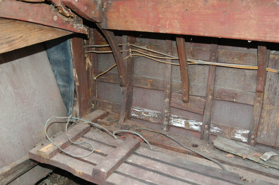 The original dashboard was moved ahead to enlarge the front cockpit into two cockpits. We believe this is the original steering column, but it appears that the steering wheel is a bit newer. but we are not sure. It is clear that the wheel was also moved ahead. The column matches columns used by Lincoln in the 1920s the wheel would have been made of wood.