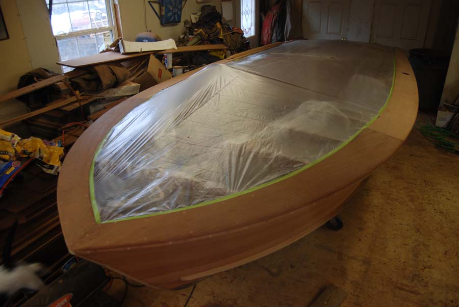 Staining the hull with Interlux 1579a Red Mahagony stain. A perfect match to Centurys original stain.