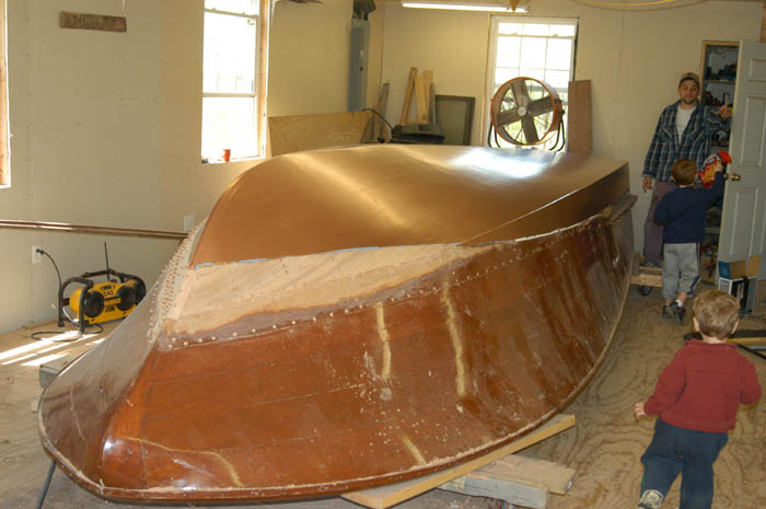 Working on the keel. The forfoot mounted and the new keel clamped into place. The keel clamped in position and being bolted in permentatly. Working on chine location at the Allegheny Chapter Fall 2004 Workshop. Installing the chines, December, 2004. Inner bottom April, 2005. Dry fitting the bottom. The bottom completely dry fit and ready to be removed for final installation. Spreading out the 3M 5200. Canvas layer over the 5200. The canvas becomes saturated with 5200. The back side of the planks are then buttered with 5200 and installed. The last bottom plank being installed. May 6, 2005, the bottom planking is installed and waiting to cure. The excess canvas will then be removed.