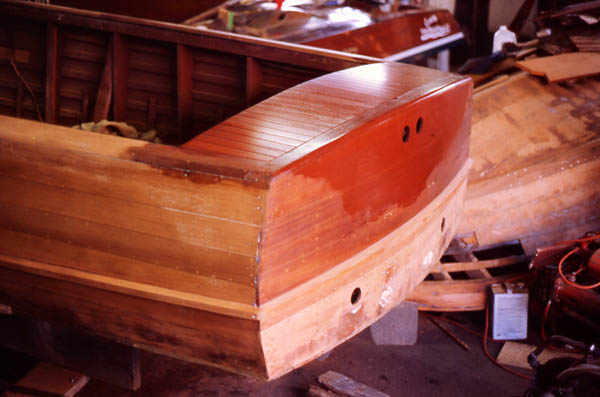 In the mid 1990s it was decided to just refinish the boat with a few new planks. But in 1995 it was decided to remove the dock lights were removed the four planks were replaced. The boat aslo had new decks installed , stained and sealed. The boat is being perpared for rolling over. The fact that this is a personal boat means it was put on the back burner several times.