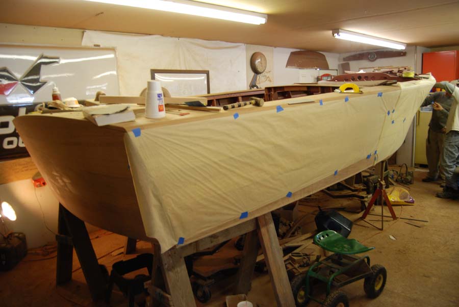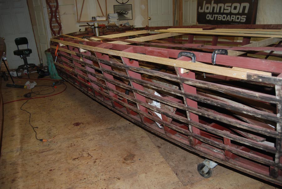 Using old planks to shape the top of new shear strake. This will assure the proper