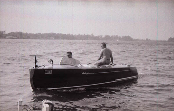 August of 1956 photo. This boat, as were many boats of the era, was updated as time went on. The deck was changed to look like an early 50s Century Seamaid with blonde decks, and the boat also has newer Seamaid style vents and seats. The people in the photo are Charles L. Miklos on the boat, Bernard Ditmore Jr. on the dock, Lois Miklos, (now Snyder), in the water and Chuck Miklos cleaning the boat. The dogs name was Sandy.