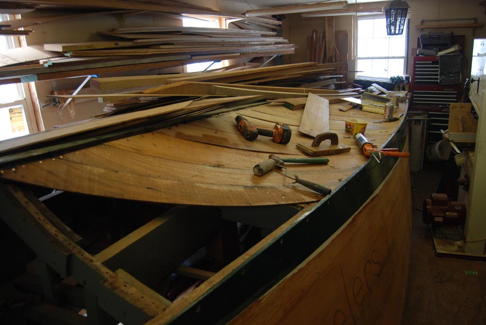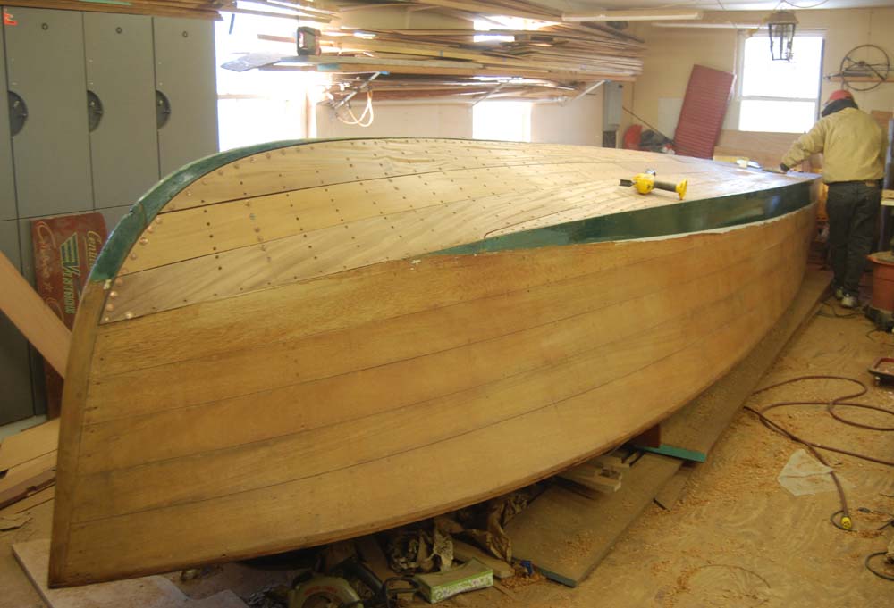 The boat as found at the Antique Boat Center in Cincinatti. The boat had know problems. This boat had a new bottom put on in the 1990s plywood was used for the inner bottom in place of the solid inner planking as original. This plywood failed. The bottom was known to be very questional at purchase.